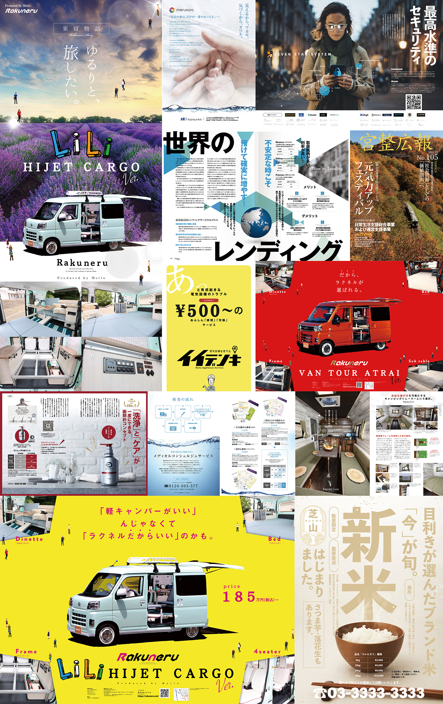 パンフレット、リーフレット、チラシ、広告、販促グッズなど、クライアント様の意向にあわせて制作いたします。